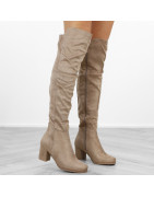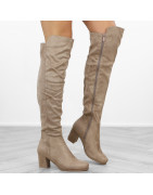 Beżowe kozaki damskie za kolano na obcasie słupku ocieplane zamsz muszkieterki